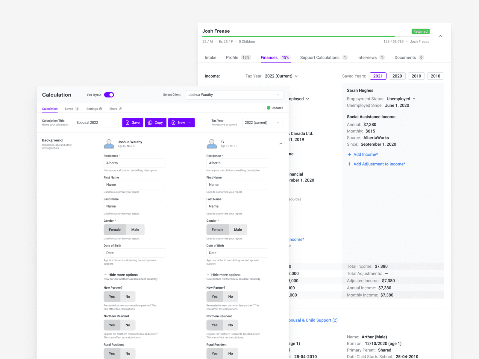 DivorcePath was conceptualized as a centralized platform that consolidates client data, supports automated financial interviews, and provides calculators and tools for estimating support and generating court-ready documents — all through an intuitive, UX-focused interface.